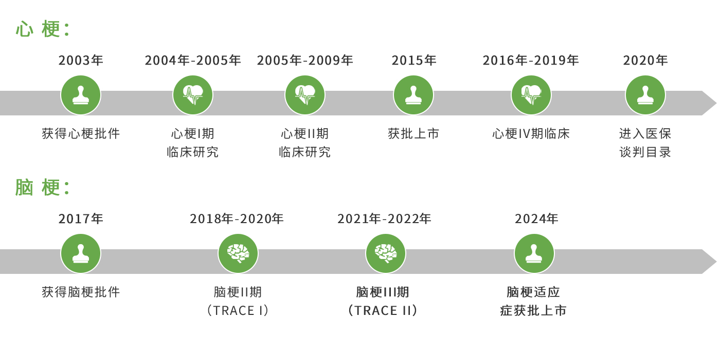 明復(fù)樂(注射用重組人TNK組織型纖溶酶原激活劑,rhTNK-tPA)是國際最新的第三代特異性溶栓藥,2015年獲批用于急性心梗的急救治療,填補(bǔ)國內(nèi)空白。腦梗溶栓于2022年完成三期臨床,研究結(jié)果發(fā)表在柳葉刀,是中國腦血管病注冊(cè)研究第一次登上國際頂級(jí)醫(yī)學(xué)期刊。2024年1月腦梗溶栓適應(yīng)癥在中國獲批上市。