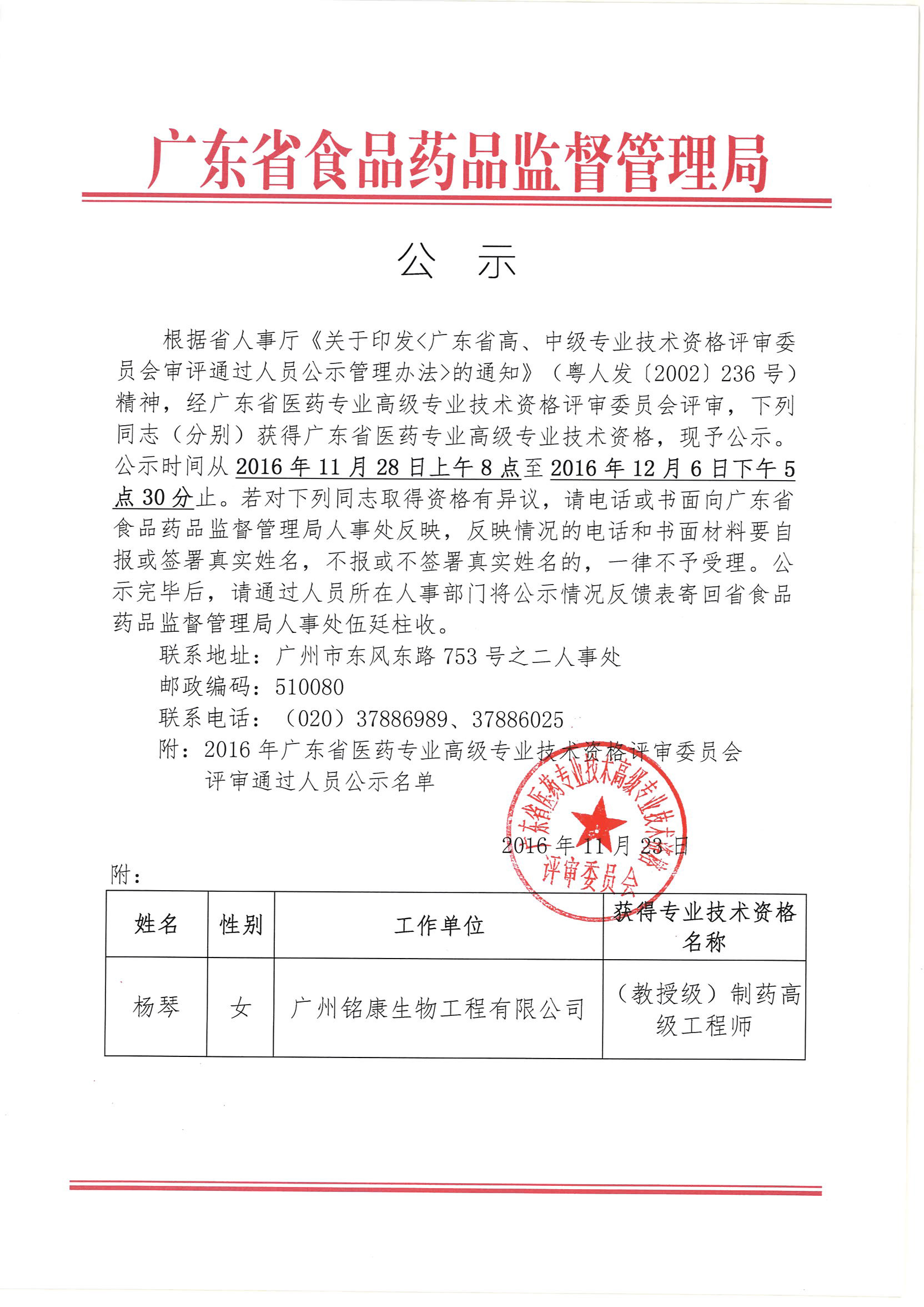關(guān)于楊琴同志獲得廣東省(教授級)制藥高級工程師專業(yè)技術(shù)資格的公示